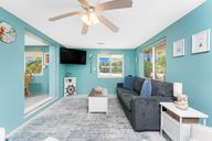 Modern gray cabinetrySpacious shelled drivewayPaver deckOversized awningTrue backyard tropical oasisFrameless glass partitionImpact windows