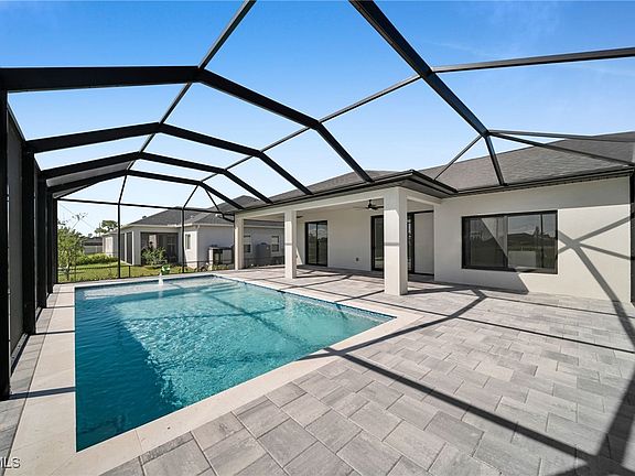 BEST PRICED NEW CONSTRUCTION POOL HOME IN CAPE CORAL! Experience luxury coastal living in this stunning 2025 new construction featuring 3 bedrooms + den, 2 bathrooms, a 3-car garage, and an impressive 14 x 28 pool, fully screened. Enjoy 12’ ceilings, 8’ doors, and porcelain tile throughout. The modern kitchen boasts quartz countertops and sleek finishes. The spacious backyard and extra-large driveway offer comfort and convenience. All located in an amazing neighborhood in the heart of Cape Coral! Builder offering closing costs and 10 year warranty!