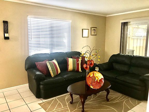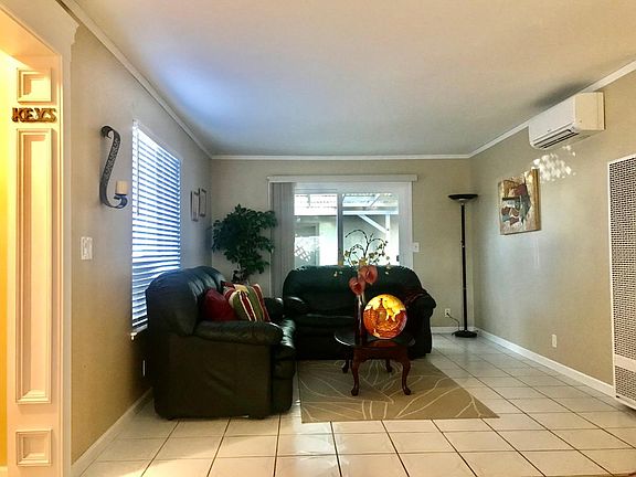 Gorgeous 2 Bedrooms, 1 Bathroom end unit home nestled in the quiet beautiful park like complex! Lots of upgrades in great location*Tile floor throughout*Double pane windows*Spacious living room & dining area*Crown molding in living & dining area*Gourmet Kitchen features granite counter tops, white cabinetry, big stainless steel sink, microwave and electric range/oven plus water purify system*Carpet flooring in 2 bedrooms*Upgraded bathroom with tub, toilet, cabinets & vanity*Wall-mounted heating & cooling units at living room & master bedroom*Refrigerator stay*Inside laundry*Private courtyard for kids play*Detached side-by-side 2 car garage*Low HOA $292*Great commute location with easy access to major highways, close to shopping area and restaurants*AS-IS Sale*Make this dream property to be your new home!