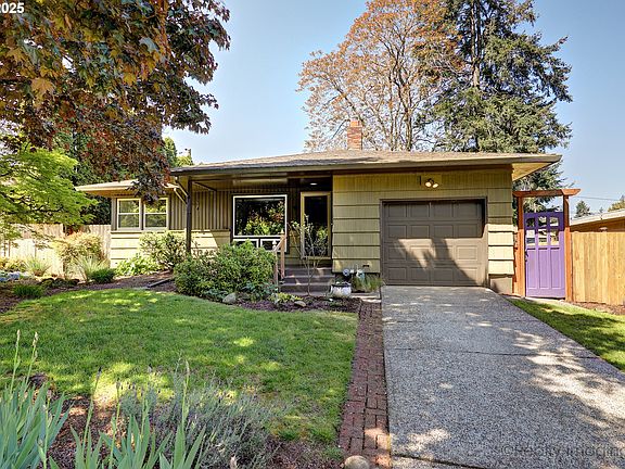Nestled on a picturesque tree-lined street, this nostalgic abode offers a perfect blend of both 50's allure and modern updates. Don't forget to sip your morning coffee on the cozy covered front porch! Step into a lovely, spacious living room with a gas fireplace. Warm oak hardwoods throughout the main are met with ample light, making a happy home all year long! Cook dinner in your classic kitchen featuring SS appliances, concrete countertops, a granite island for food prep and a sunny garden window to grow your herbs. The open, formal dining room provides a slider to an oversized, fenced backyard, featuring a charming flagstone covered patio with a tin roof to enjoy the sound of a good spring rainshower. The lush, low-maintenance yard offers a sweet paradise with tons of sunshine for gardening and a terrific tree for climbing, plus a basketball court! Three bedrooms on the main level, all of varying sizes, have vinyl windows and custom shutters. Huge basement with high ceilings and separate entrance for possible ADU or multigenerational living. Basement includes family room with 2nd gas fireplace, bonus room, 4th bedroom (non-conforming), full bath and laundry room. 1 car garage with storage and opener. Newer thermostat, dishwasher & fridge. 2014 roof has just been cleaned. Entire main level has been freshly painted. Just minutes to cafes, pubs, parks, coffee, MAX, busline and services. This house is all about fun and comfort, both inside and out, and ready for your personal touches! [Home Energy Score = 4. HES Report at https://rpt.greenbuildingregistry.com/hes/OR10237591]