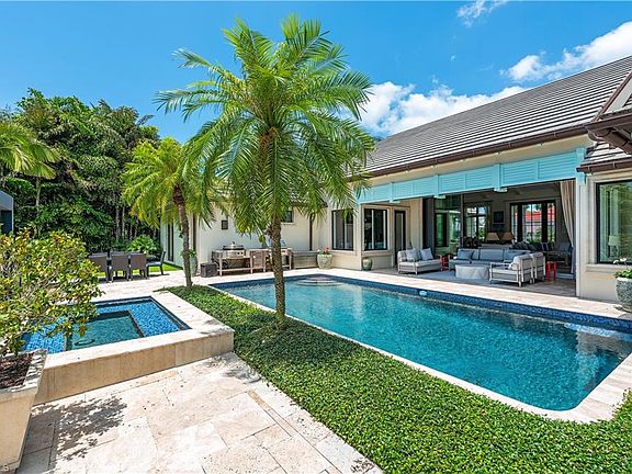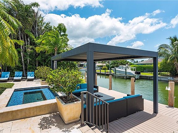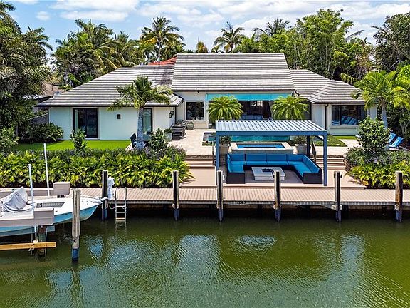 Step into luxury with this meticulously crafted home, a masterpiece designed by renowned Stofft Cooney Architects. Nestled in a serene setting, this stunning property boasts 4 bedrooms and 3 baths, offering unparalleled comfort and elegance. Only a portion of the original slab from 1977 remains after this home’s remarkable transformation in 2014. The details of this home showcases exquisite craftsmanship and thoughtful design. From the stabilization of the helical pilings, to the concrete masonry, steel, and poured concrete tie beams of the exterior walls, to the Anderson 400 series laminated windows and French doors, every element is chosen for its quality and durability. Outside, relish in your own private oasis, complete with a saltwater pool, spa, gas fire pit, and lanai with motorized bug screen and solar shade. The pool deck features sand-set Turkish limestone, while the driveway boasts concrete pavers with turf inserts. A 1,000-gallon propane tank buried in the front yard supplies gas to the cooktop, Evo grill, fire pit, pool/spa heater, and more. The elevated rear yard steps down to dock with Aztec decking, and a 13,000 pound boat lift with controls. The interior is equally impressive, with custom cabinets, engineered white oak wood flooring, and Lutron low-voltage lighting throughout. The kitchen and bar are outfitted with Sub Zero and Wolfe appliances, exotic granite, and quartz countertops, perfect for the discerning chef. Entertainment and comfort are seamlessly integrated with a wet bar, and smart home system by Savant that controls the surround sound audio, TV’s, lighting, motorized shades, and security cameras throughout. Luxury meets functionality in every aspect of this home, from the custom-designed ceilings and millwork to the motorized black-out shades in the primary suite. You can rest assured here - a whole house generator and superior elevation keep this property high and dry and never without power during a storm. FEMA policy less than $1k last year and can be assumed by the Buyer. This home offers the ultimate in modern living, where every comfort and convenience has been carefully considered.