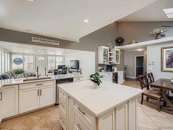 Welcome Home ~ Single-story remodeled Poway home ~ solar serves the house & pool. Bright/Light/White kitchen~ quartz counter tops, stainless appliances, tile floors, skylight, & cathedral ceiling, plus a bonus/Family room open to the kitchen & privacy shutters. Living room features a tiled fireplace (gas/wood). Updated baths, luxury-vinyl flooring, new doors & knobs, lighting, ceiling fans, electrical outlets, closet doors & built-ins. guest bedroom includes a built-in Murphy bed. Finished garage, built-ins, 220V. Sparkling pool, Mountain View, mature low-maintenance landscaping. NO Mello Roos, No HOA, Heart of Poway, award-winning PUSD, Poway Lake, Parks, trails, shopping, & dining nearby. Recent updates: Dual pane windows, New roof 2013, HVAC 2003, water heater 2024 (40 gal), Solar 2021. 5" floor molding, Kitchen Island moves with tile underneath, Cabinets have pull-outs, trash container included inside the cabinet, drawer organizers, soft close drawers, spice rack, storage space for large cookie sheets, & kitchen ladder. Lift in Garage & pull down Attic ladder in Family room/Bonus room is 200 sq ft, no permit known, included in the square footage of 1,500 on this listing according to the insurance company. Front fascia and trim recently replaced. Garage cabinets & Shed convey.