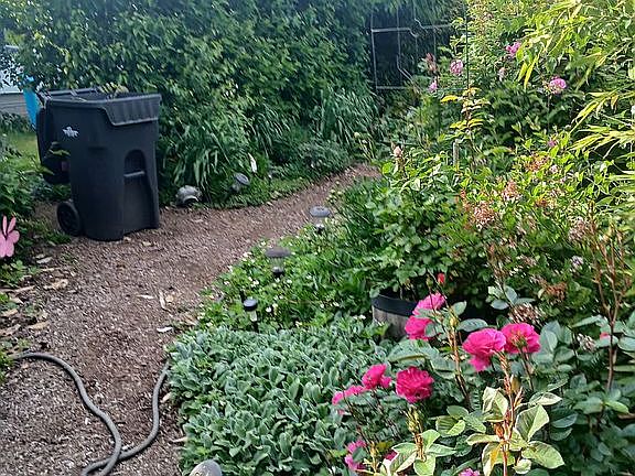 Secret garden like large lot, with fruit trees, berries and lovely flowering plants, a gardeners delight.