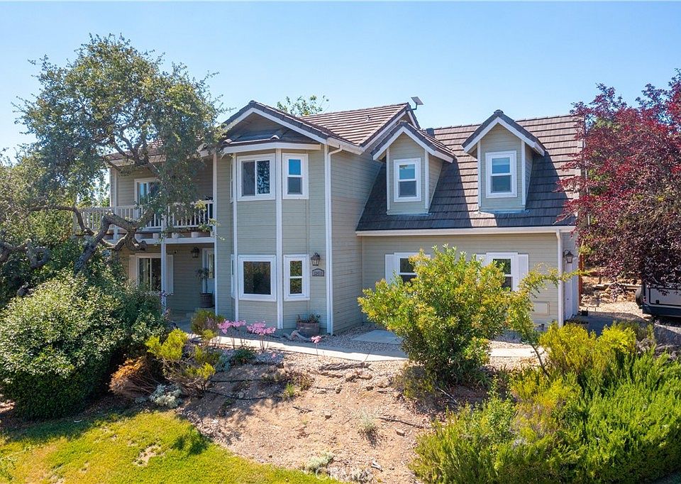 Nestled on 1.4 acres, this hilltop home boasts panoramic valley and hillside views in the highly sought after West Atascadero location. Step through the French entry doors into your hardwood floor foyer with high ceilings, crown moulding, and a stunning wrought-iron spooled staircase. Downstairs is the kitchen with custom granite counters, stainless steel appliances, coffee bar, dry bar, and breakfast nook with bay windows looking out to your backyard. Dine in the formal dining room as you overlook Long Valley or cozy up in the family room with the brick-surround gas fireplace. Upstairs is the extra-large master suite featuring vaulted ceilings, a custom organized walk-in closet, private balcony tucked amongst the oaks, and an ensuite with a jetted tub, glass-enclosed shower, and dual sink vanity. Down the hall are the additional bedrooms and bonus family room that can be used as a 4th bedroom, game room, office, you name it! Enjoy the park-like setting in your backyard with the large lawn, covered patio, custom built-in BBQ, and hot tub that has the most incredible sunset views over the West Atascadero hills. Amenities include a fully owned robust solar system (so you can blast your A/C guilt-free), whole house water softener, two sheds, chicken coop, newer septic (2018), and fully field fenced yard. Surrounded by oak trees, this home has a treehouse feel, and with high-end picture windows throughout, every room takes advantage of the sweeping views. Experience country living just 10 minutes from town.