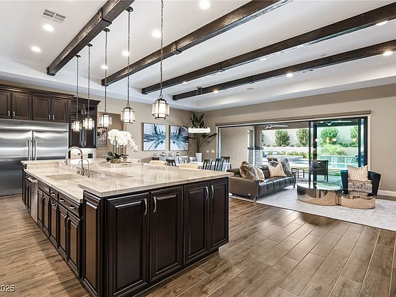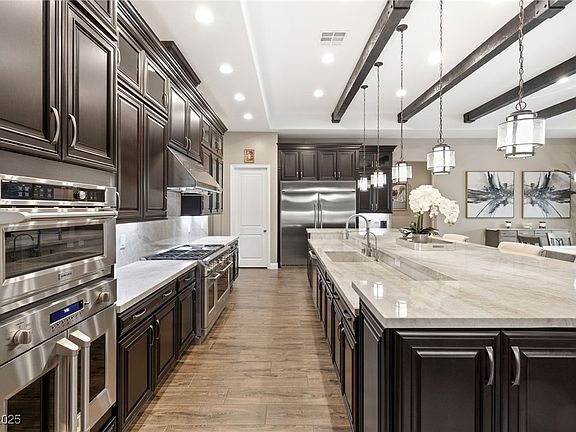 This luxurious single-story home in a gated community near Downtown Summerlin is ready for immediate move-in. A charming courtyard entrance leads to an elegant open floor plan with soaring ceilings. Highlights include an executive office with French doors, a media/game room, and a refined dining room adjacent to a butler’s pantry. The chef's kitchen lies at the heart of the home, flowing into the great room with an entertainment wall, fireplace, and wood-beamed ceiling. It features a 15-foot island, Quartzite countertops, custom-lit cabinets, high-end Monogram appliances, and a walk-in pantry. The primary bedroom includes a fireplace, dual walk-in closets with direct laundry access, and a spa-like bath with a soaking tub inside a spacious shower. Pocketing sliding doors open to a resort-style backyard with a pool, spa, and covered lounging area. An outdoor kitchen under the covered patio. A deep three-car garage with custom glass doors and epoxy floors completes this exceptional home.