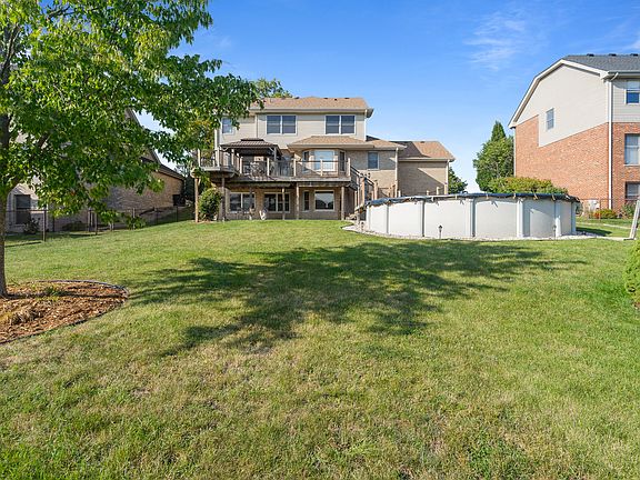 Welcome to this beautiful and well-maintained two-story home in the highly sought-after Kingston Hills subdivision! A charming covered front porch sets the tone as you enter this spacious residence featuring a large kitchen with an abundance of oak cabinetry, a pantry closet, and a sunny breakfast area with access to the maintenance-free composite deck with attached gazebo and connection for a gas grill. Enjoy summer days in the large fenced yard complete with a 24-foot round pool and a versatile shed with an 8-foot overhead door. The inviting family room showcases hardwood flooring and a cozy gas-log fireplace, while the separate living room and formal dining room with bay window offer great space for entertaining. Upstairs, the master bedroom features tray ceilings, a private bath with a whirlpool tub, separate shower, and a walk-in closet. All four bedrooms are finished with attractive wood laminate flooring. The desirable finished walk-out basement adds even more living space, including a recreation room with direct access to a covered concrete patio, plus a fifth bedroom and half bath (that needs finishing touches) -perfect for related living. Additional updates include a roof, 4" downspouts, gutter guards and hot water heater that are only five years old.