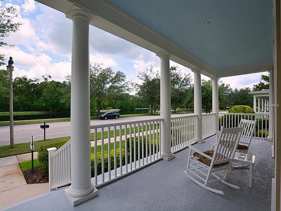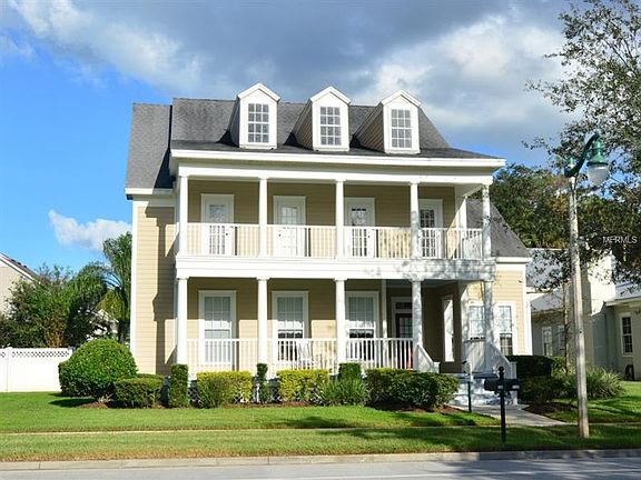 Come see this spacious "Newport - Coastal" in centrally located South Village in Celebration. This home has remarkable views of water from the front porch and second floor gallery. In the rear garden, a screened-in pool and spa provide idyllic setting for enjoying the Florida warmth and sun. This airy and open floor plan has a central living room with fireplace and soaring double height ceilings. The master bedroom is located on the first floor with a door to rear porch and pool. Master bath has separate shower and tub with dual vanities. The kitchen is open to the family room and features 42" raised panel maple cabinets, a breakfast bar and a breakfast nook with bay window. New stainless steel Energy Star appliances! A private den or study off the foyer is separated with a double French door. Stairs from the foyer and family room make their way to the second level where three additional bedrooms are located, two with access to the second floor gallery. Also upstairs, a loft provides space for games and entertaining. A 5th bedroom and bath are in the apartment over the garage. The garage apartment is currently leased for income at $1000/month. The three car garage and a deep driveway provides parking space for 6 vehicles. Home was only used occasionally by original owner as a vacation home. Master HOA assessment is $930.72 per year with an additional $296.40 per year passed through by HOA for trash/recycling. CDD fee is included in the annual tax bill. Brand new carpet in main house.
