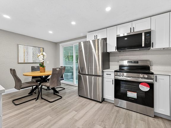 The kitchen comes equipped with a fridge, sink, oven, stovetop, microwave, as well as upgraded appliances.