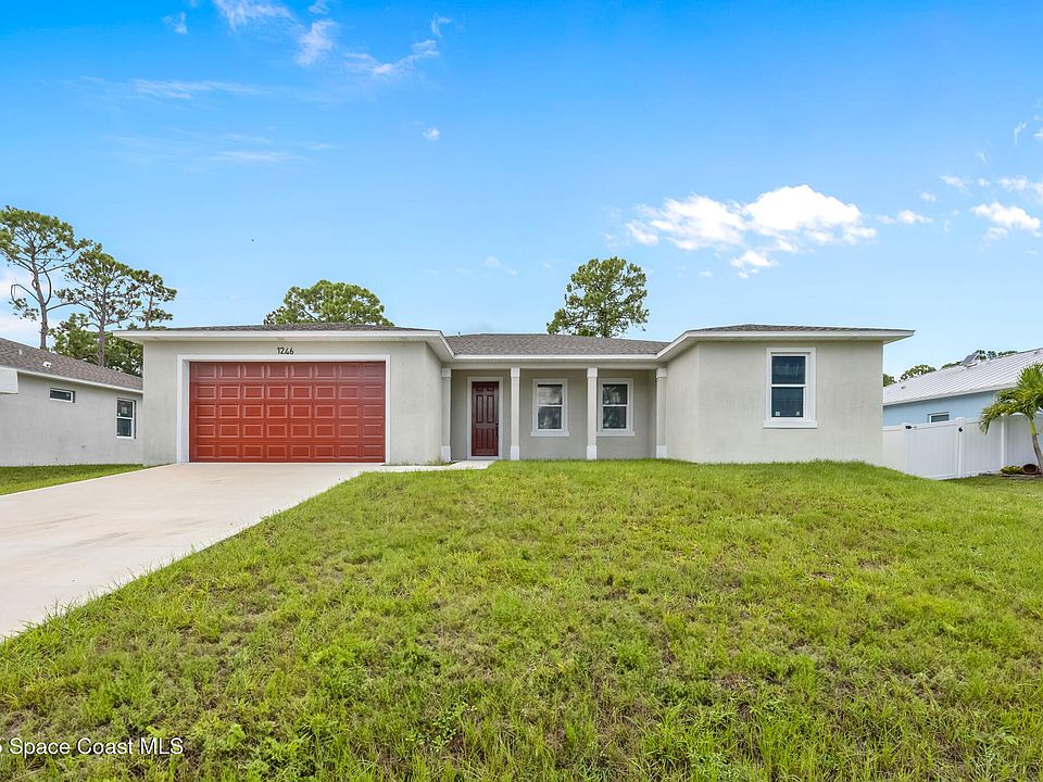 Why wait to build when this stunning 4-bedroom, 3-bath home already has everything you've been looking for—no HOA and no need to pay for upgrades, because this home has it all! With 2,238 sq. ft. of living space, the open floor plan flows effortlessly from the kitchen to the dining and living areas, perfect for entertaining or relaxing at home. A private junior suite provides ideal flexibility for guests or multi-generational living. Every detail has been thoughtfully selected, from soft-close cabinetry and hurricane impact windows to ceiling fans in every room. Enjoy year-round comfort on the screened-in back porch or relax on the front and rear under-air porches. The fully fenced yard offers privacy and security in a peaceful Southwest Palm Bay neighborhood. Construction is nearing completion—don't miss your chance to own a move-in-ready home loaded with upgrades!