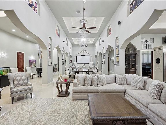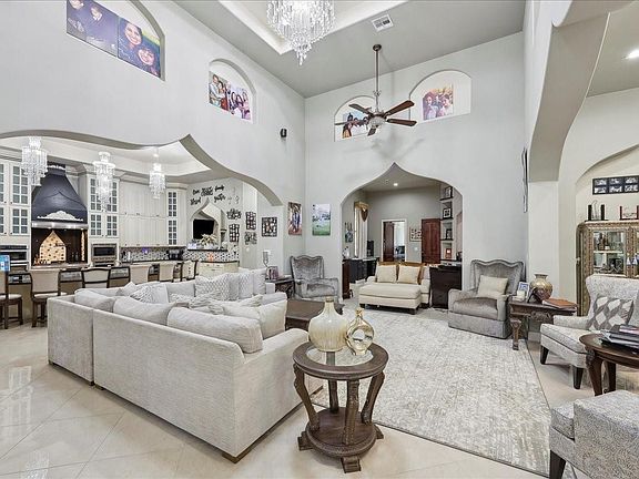 Experience unparalleled elegance in this magnificent Mediterranean-style estate, offering over 8,173 sq ft of sophisticated living space ona sprawling 2.57-acres. Inside features custom marble tile flooring and soaring ceilings that create an atmosphere of opulence,complemented by exquisite chandeliers and cabinetry throughout. The gourmet kitchen is equipped with stainless steel appliances, thiskitchen is a chef's dream! Each of the spacious bedrooms boasts its own en-suite bathroom and walk-in closets. Outdoors features acovered patio, adorned with elegant tile, features an outdoor kitchen, cozy fireplace, and a full bathroom—perfect for hosting gatheringsyear-round. Enjoy the gunite in-ground pool and hot tub, enclosed by wrought iron fencing, offering a serene retreat for relaxation andleisure. The remarkable 5,538 sq ft covered basketball court provides endless opportunities for recreation and fitness.