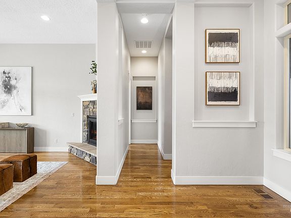 Surrounded by the scenic beauty of the Boise Foothills, this 4-bed, 3-bath, 3-car home offers 2,895 sq ft of refined single-level living with an upstairs bonus room for added flexibility. Perfectly positioned on one of Hidden Springs’ most desirable and sought-after streets, Upper Ridge Place ends in a quiet cul-de-sac beside multiple trailheads—where privacy, peaceful surroundings, and nature abound. No backyard neighbors, with open space and rolling foothills right in your backyard—plus incredible sunsets you’ll never tire of. Inside, rich hardwood floors, soaring 10-foot ceilings, and expansive windows invite natural light and warmth throughout. The open-concept kitchen features granite counters, double ovens, a breakfast bar, and dining space that flows easily into the great room. The split floor plan highlights single-level living with the primary suite on the main, offering a spa-like bath with soaking tub, walk-in shower, and dual vanities. Hidden Springs offers an active lifestyle with community pools, parks, fitness center, organic garden, 800+ acres of open space, and scenic trails—foothills living at its best!