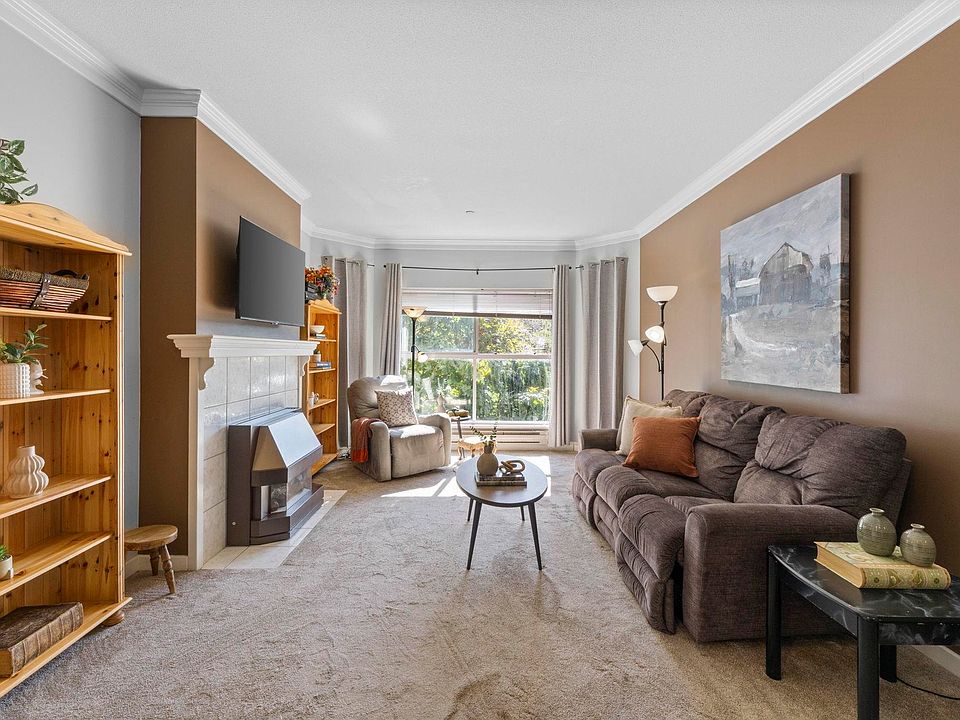 Spacious 2 bed 2 bath condo in prime Pitt Meadows location on north side of the tracks. This well maintained home offers a quiet, treed outlook from the balcony & has been thoughtfully updated over the years w/ all newer appliances, countertops, lighting, H/W tank (2022) & more! Fantastic layout that features a functional kitchen, generous living space w/ cozy gas fireplace & 2 comfortable bedrooms on opposite sides, including a private primary w/ ensuite bathroom. Includes 1 parking & 1 locker & gas is included in the strata fee. Pet-friendly building that allows a large breed dog. Close to parks, trails, shops, transit, theatre, W/C Express & quick hwy. access. A perfect blend of comfort, convenience & nature-welcome home. *BONUS - Seller is paying your strata fees for 6 months!*