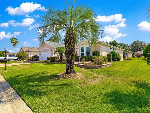 Discover this well-maintained 2 bedroom, 2 bath home plus a den in the highly sought after 55 plus premier golf community of Del Webb Spruce Creek Golf & Country Club. This stunning Madeira floor plan offers exceptional curb appeal with a stained driveway, stacked-stone landscape walls, and a welcome and inviting courtyard entry leading to an elegant leaded glass entry door. Step inside to find touches such as crown molding and plantation shutters, adding sophistication to every room. Tile flooring graces the foyer and all wet areas, while the separate den features parquet wood flooring, making it a perfect home office or flex space. The updated kitchen is a true showstopper, boasting white cabinetry, glass tile backsplash, Corian countertops, newer stainless-steel appliances, recessed lighting, and pendant lighting above the breakfast bar, while above-cabinet recipe windows allow for added light. Enjoy anytime dining in the breakfast nook with a charming bow window. The inside laundry and garage have added overhead storage. The spacious primary suite includes crown molding, plush carpet, a large walk-in closet, and a bow window for added space. The updated ensuite bath includes stone wainscoting, dual raised sinks, and a walk-in shower. The guest bedroom and bath are equally impressive, with crown molding and updates that include stone accents, a raised sink, and a therapeutic soaking tub. Additional highlights include extended garage for extra storage and housing the HVAC system, a tankless water heater for efficiency, and re-shingled roof in 2022. Designed for entertaining, the open floor plan flows seamlessly to the split Lania with one side having an expansive birdcage overlooking the well-landscaped backyard allowing for some privacy, while the other side is an enclosed lanai with a bonus second refrigerator and television. Furniture is available for purchase as a separate package. Enjoy resort-style living with golf, pools, fitness, dining, and endless activities in one of Florida’s premier active adult communities.