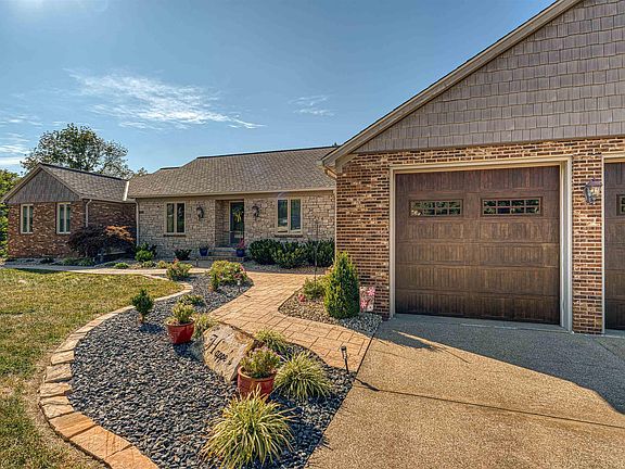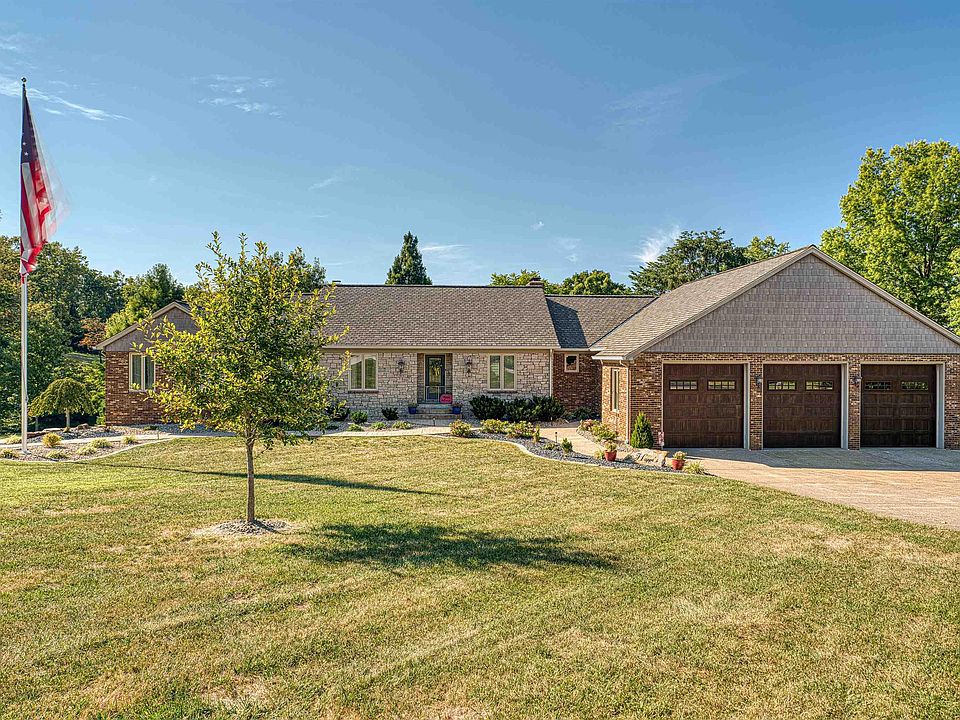 Welcome to this stunning 4 bedroom, 4 bath craftsman-style ranch with a finished walkout basement, set on 2+ rolling acres with breathtaking lake views. Offering over 5,100 finished square feet, this home combines timeless character with thoughtful updates and exceptional functionality. Inside, you’ll find an inviting open floor plan with large rooms, hardwood floors, beamed ceilings, and abundant natural light. The updated kitchen is a chef’s dream, featuring granite counters and backsplash, a leathered granite center island, premium appliances, and a seamless flow into the vaulted family room with fireplace. A formal dining room with wainscoting sets the stage for elegant entertaining. The primary suite is a true retreat, with a cozy fireplace, panoramic lake views, and a completely renovated spa-like ensuite. The finished lower level expands the living space with a spacious family room, bar, fireplace, rec room, custom built-ins, and multiple storage areas. Outdoor living is equally impressive with expansive patios, new concrete walkways, professional landscaping, and serene lake views. Additional highlights include a 3-car garage with 10 foot tall doors is designed to double as an entertaining space, a finished basement garage ideal for a workshop, new French doors throughout, home generator, new lighting, and a lifetime roof. Located in a quiet, established area with easy access to Highway 41 and I-64, this move-in ready lakefront home blends luxury, comfort, and convenience in one perfect package.
