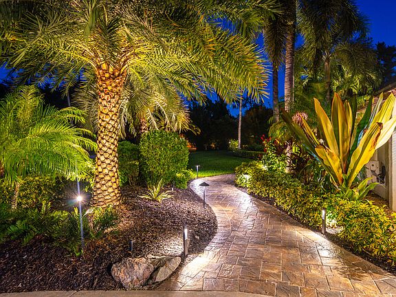 Custom outdoor LED landscape lighting, showcasing the tropical grounds at night.