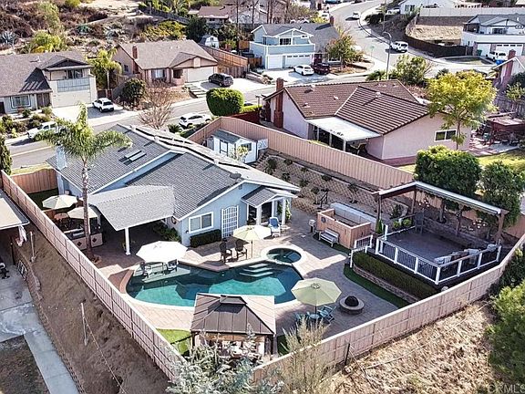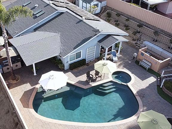 Nestled in a lovely neighborhood, this exquisite 3-bedroom, 2-bathroom home spans 1,660 square feet of meticulously designed living space, offering the perfect blend of luxury, comfort, and sophistication. An entertainer’s dream, this residence has been thoughtfully updated to ensure every detail reflects both elegance and functionality. Upon entering, you're greeted by a stunning living room showcasing crown molding throughout , recessed lighting and a fireplace for complete ambiance as you relax after a long day. A beautiful kitchen will then greet you complete with elegant quartz countertops, modern, high-end appliances, and an open, airy layout ideal for both intimate meals and grand gatherings. The adjacent dining room features built-in bookcases and custom storage, creating a refined space for dining and relaxation. Throughout the home, newer systems, including a high-efficiency HVAC, water heater, and extensive electrical upgrades, have been seamlessly integrated for convenience and peace of mind. Step outside to the outdoor living space which is nothing short of spectacular, designed to elevate your lifestyle. The shimmering pool with a baja step and a built-in jacuzzi invites relaxation, while the outdoor kitchen—equipped with a BBQ, sink, and bar seating—serves as the perfect backdrop for hosting memorable gatherings. The covered patio area adjacent to the dining area, with its ceiling fan and lighting, offers a serene retreat, while the upper Trex deck, outfitted with electrical outlets, solar lighting and a retractable canopy, provides sweeping views and an idyllic setting for evening cocktails. An outdoor firepit further enhances the ambiance, providing warmth for cooler nights, while a covered gazebo with lighting and electrical wiring is the ideal spot to create an alfresco entertainment area or outdoor media room. Beyond the luxurious spaces, the side yard offers a pet-friendly gated area for your furry friends. The other side of the home is beautifully complemented by a charming shed along with terraced rose trees, adding a touch of nature’s beauty to the property. The yard is meticulously landscaped with sprinklers and an efficient irrigation system, ensuring effortless maintenance. Back inside, the home is bathed in natural light, thanks to skylights in the living and dining areas. Custom shutters throughout the home add a refined touch, while the spacious master suite features a spa-like bath with a walk-in shower and a generously sized closet. For added versatility, one of the bedrooms features a Murphy bed with built-in storage, offering an elegant solution for both guests and everyday living. Designed with an emphasis on both style and practicality, the home includes 28 owned solar panels—no lease—ensuring energy efficiency and sustainability. The finished garage, with ample storage, is an added bonus, providing both utility and sophistication. With every corner reflecting impeccable attention to detail, this residence is a true testament to pride of ownership. A home of this caliber must be seen to be fully appreciated.