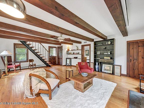 Whether you're looking for a weekend retreat or a year-round residence, this property offers a unique opportunity to own two homes on nearly 6 wooded acres of sub-dividable land. The main house, a charming farmhouse built in 1880, is brimming with character and distinctive features, including rich wood-beamed ceilings and wide plank hardwood flooring throughout. The eat-in kitchen has been updated with new butcher block countertops and modern appliances, leading into a cozy sitting area. The open-concept living room showcases a stunning stone wood-burning fireplace, serving as the room's central focal point. The full bath has been recently renovated to provide contemporary comfort. Upstairs, you'll find two bedrooms, a half bath, and another sitting area, perfect for relaxation. Adjacent to the main home is a quaint cottage with a one-bedroom layout, a kitchenette area, a full bath, and a loft. This additional space is ideal for short or long-term rentals, a workspace, or an art studio. The properties are conveniently located close to Woodstock, Zena Recreational Park, trails, shopping, restaurants, wineries, galleries, and more, offering a perfect blend of rural charm and accessibility to amenities.