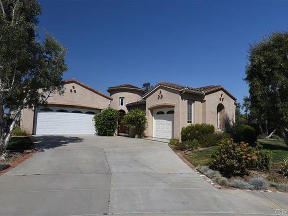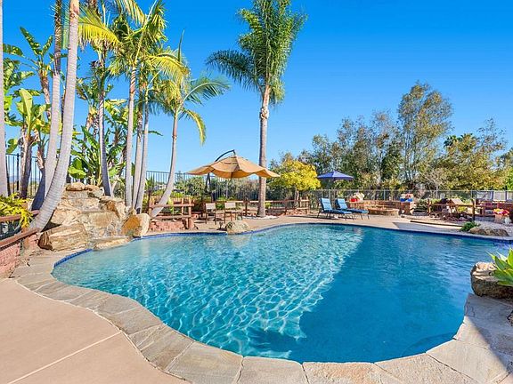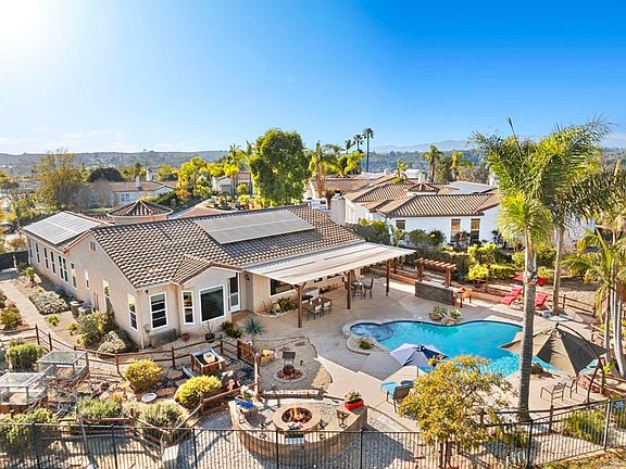 This home is an entertainer’s and gardener’s delight in peaceful Fallbrook. 1247 Firecrest Way is a breathtaking Tuscan-style estate featuring a desirable single-story floor plan with a pool and jacuzzi, an eight-person fire pit, a large custom garden, a mini citrus orchard, and an elevated gazebo with stunning views. Built in 2000 and thoroughly remodeled in 2018 by the present owners, this home boasts 2,861 square feet on a lush, fully flat 0.5-acre lot at the end of a quiet cul-de-sac. It features 3 spacious bedrooms with bonus room/additional bedroom opportunity and two and a half baths. The third-car garage provides ample storage, space for a motorcycle, a home gym, or an artist’s studio. The property is just minutes from shopping, restaurants, wineries, and equestrian opportunities. Stepping inside, the home showcases a beautifully reimagined interior with extensive upgrades. All flooring was replaced with stylish cedar-style tile, offering a sleek yet low-maintenance look. The interior was professionally repainted, and dual-pane energy-efficient windows were installed throughout, enhancing both comfort and efficiency. A butler’s passage connecting the kitchen and dining room was converted into a spacious walk-in pantry, while a small hallway closet was removed to expand the laundry room. The outdoor spaces have been completely transformed into a stunning retreat. A paid-off solar system, installed in 2019, eliminates electricity costs. The front yard was redesigned with drought-tolerant landscaping on an automatic sprinkler system, colorful plant selections, terracotta paths, and attractive rock accents. Architectural stonework was added to the garage entries, courtyard, and turret, complemented by professional exterior painting for enhanced curb appeal. The backyard is where this home truly shines, offering a resort-style atmosphere with a beautifully upgraded pool and spa. All-new concrete decking, a custom pony wall, and a new stairway lead to a private citrus orchard with tangerine, lime, orange, and lemon trees. Elevated garden boxes were thoughtfully built with protective wire mesh to keep out birds and ground critters, ensuring a perfect space for homegrown vegetables and herbs. A spacious shed, placed on a concrete pad, provides additional storage for gardening tools and supplies. Nearby, a built-in fire pit with lava rocks from Hawaii creates a cozy setting for evening gatherings, while the large custom outdoor BBQ, connected directly to the gas line, makes entertaining effortless. Built-in lighting ensures a seamless cooking experience, even after sunset. A soothing waterfall adds to the tranquil ambiance, and all pool functions, including temperature settings, are conveniently controlled by a keypad near the backyard entrance. This peaceful sanctuary offers breathtaking views, especially from the custom-built lifeguard chairs overlooking the hills and, in the winter, the snow-capped mountains of San Jacinto and Lake Arrowhead. Whether sipping wine at sunset or enjoying the vibrant colors of the “Golden Hour,” this space is designed for ultimate relaxation. Families will appreciate the home’s location within the Fallbrook Union High School District and Fallbrook Union Elementary School District, offering access to excellent educational opportunities. 1247 Firecrest Way is more than just a home—it is a thoughtfully curated retreat offering modern conveniences, stunning outdoor spaces, and a lifestyle of tranquility. With its combination of timeless architecture, sustainable features, and custom enhancements, this exceptional property is a rare gem in one of Fallbrook’s most desirable neighborhoods.