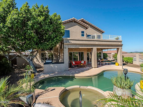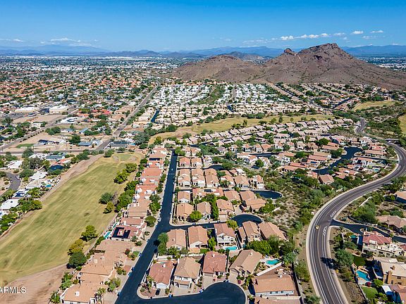 Stunning Moon Valley home has it all-privacy, views and an unbeatable location! Perfectly positioned at the end of a quiet cul-de-sac with no direct neighbors on any side. Nestled against a natural desert wash and perched on an elevated lot, the home enjoys both privacy and sweeping sunrise & sunset views. Inside you'll find an airy open-concept layout with abundant natural light and mountain views from nearly every room. The upper level features high-end hardwood floors and the home has been updated with modern lighting, fixtures and hardware, along with newer high-efficiency smart appliances. The primary suite is a true retreat, showcasing stunning mountain views from its private patio.  The spacious en-suite bath has been beautifully upgraded for modern comfort.  Outdoor living is.. exceptional here, the backyard features a gas-heated pool and spa, built-in gas BBQ island and covered patio with a large-screen TV and remote-controlled shades.  The yard includes mature fruit trees, natural grass and an automated sprinkler system, creating a lush and inviting setting for relaxation and entertaining.  Additional highlights include a 3 car garage with overhead storage and extended depth plus an extra-large driveway for added parking-a rare find in the neighborhood.  Just steps from the Pointe Lookout Mountain golf course, scenic hiking trails and neighborhood walking and biking routes, this home combines serene desert living with unbeatable convenience.