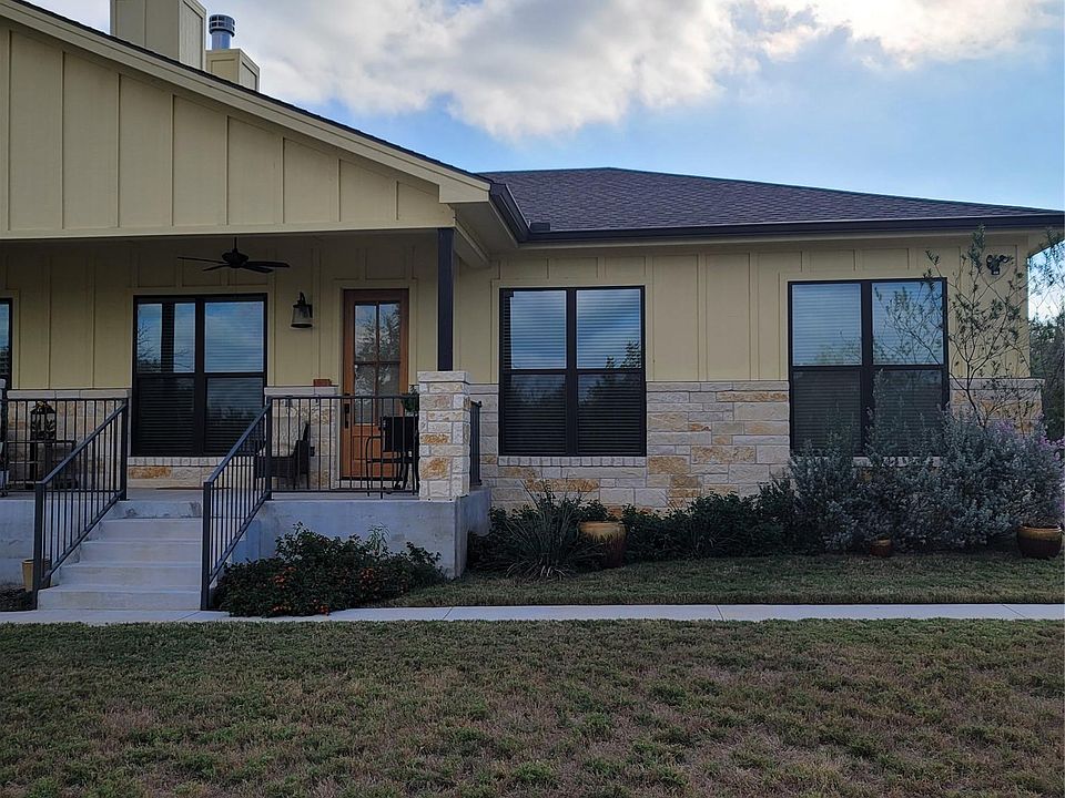 This darling half duplex is situated in a quiet neighborhood with access to the beautiful Pedernales River. The primary bedroom has an accent wall, lots of natural light and private bath with walk in closet and roll in shower. The second bedroom is spacious with a great sized closet. The office is front facing and opens to the living room with a glass door. The open concept layout of the family area has a stone hearth fireplace with hook ups for tv, a dining area, eat in kitchen island, farmhouse sink, electric range, microwave, refrigerator, dishwasher and tons of storage. The pantry/laundry room has a folding surface, coat bench and ample storage. The two car garage also has a storage closet. Have your morning coffee on the back porch with the deer and watch the sunset from the front porch every evening!