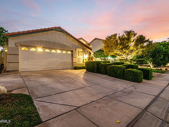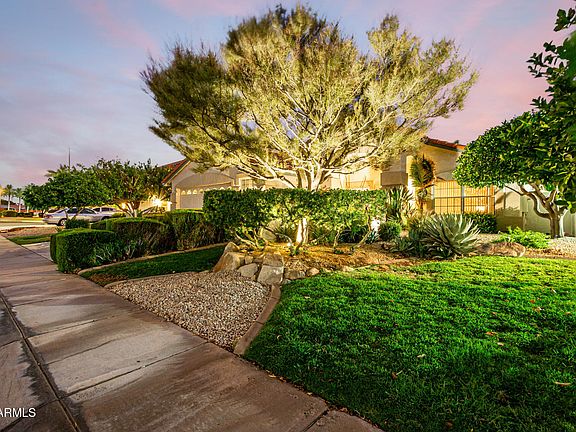 For the first time in over 10 years, one of only 11 Courtland Laramie II ranch floorplans is available for sale in Marshall Ranch. This 2,226 sq ft, single-story, 4 bed, 2 bath (one fully renovated) home is one of the largest ranch-style plans in the community. With vaulted ceilings, newer tile in high traffic areas, updated kitchen with large island, granite backsplash and countertops, SS appliances, and a spacious master suite - this home combines rare square footage with smart design. Property sits on a premium cul-de-sac lot, adjacent to the elementary school, backs to a greenbelt with no rear neighbor, and offers great curb appeal. But what really makes this house spectacular is the Resort style backyard. Over 900 sq. Ft of outdoor living under the 30x10 covered patio leading to the stylish side walkway and cool-decking - ready for year-round outdoor living. Custom pebble tec play pool with in-floor cleaning system, dual flowing water bowls flanking the striking 25-foot raised tile wall, finished in deep blue glass mosaic tile. Serving as the pool's architectural focal point - a 6-foot sheer LED descent waterfall. Perimeter Fiber Optic Lighting with a new top of the line illuminator generating a strong light display offers brilliant, color-changing illumination for dramatic nighttime ambiance. Lighting, water features, advanced filtration, and in-floor cleaning system can all be scheduled/activated independently or together via smartphone app, allowing you to set the perfect ambiance remotely. Additional backyard features include cool decking, exposed aggregate, pavers, removable mesh fencing for child and pet safety and mature tropical landscaping with date palms, plumerias, and Bismarck palms. This exceptional backyard valued over $150K to duplicate in today's market. Round this out with a new Trane AC system (2023) with a premium package 10 year labor and parts, transferrable warranty. Given its rarity, size, and upgrades, this home stands out as one of the most desirable single-story layouts in Marshall Ranch. A rare opportunity for the right buyer.