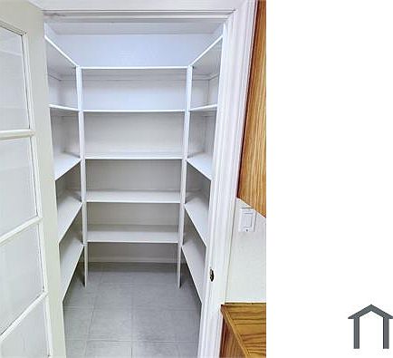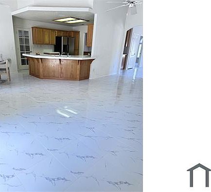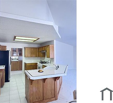 High ceilingStainless steel whirlpool stoveNice kitchen islandNew tile floorNew range hoodLot of cabinets