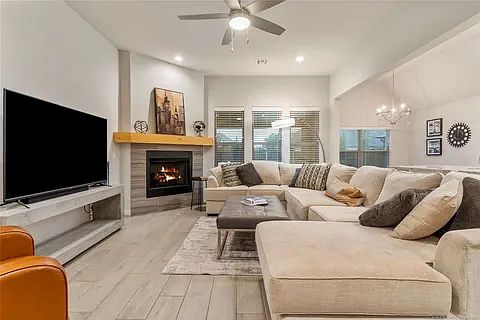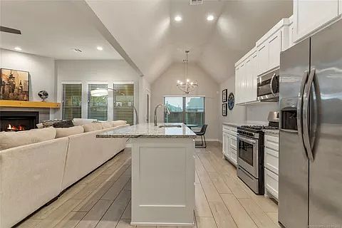 Built in 2020, the home features soaring ceilings, a gas fireplace, and a designer kitchen with granite countertops, stainless steel appliances, and a large center island. The primary suite boasts a spa-like bathroom with double vanities, a walk-in shower, a soaking tub, and a large walk-in closet.