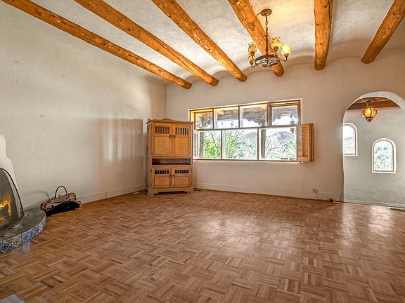 Location! Location! Possibilities abound this wonderful 2600 +/- square foot, 3 bedroom, 2 bathroom, 2 car carport home sited on an appx .79 acre lot with amazing views and minutes to the plaza. The lot has plenty of room to build with city approval. The living room boasts coved ceiling with vigas, a wood burning kiva fireplace and stunning views. The large kitchen with plenty of cabinet and counter space has an eat in kitchen nook plus an additional room/space perfect for storage and a formal dining room. There is an additional sweet “kiva room” with a wood burning stove with latilla and viga ceiling that could be used as a sitting/reading room, TV, study etc. The home was built around a lovely private courtyard with a rock fountain, mature landscaping and apricot trees on the property. Amenities and features include: Forced air heat-Coved ceiling with vigas throughout almost the entire home-Mud room-Satillo tile floors-Newer water heater-Shutters-Built-ins-Skylight and more.