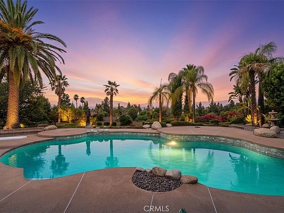 Sited on an elevated lot in Hillcrest, this sprawling single-story residence captures panoramic views over Downtown Riverside and the surrounding mountains, while offering a rare combination of privacy and open space. A stained and stamped driveway, flanked by mature landscaping, descends to a gated front courtyard. Inside, spacious living areas are accented by arched entryways, two stone fireplaces, and rich finishes. Large picture windows are thoughtfully placed, allowing the views to be omnipresent throughout the larger balance of the home. The open kitchen serves as the heart of the home, featuring granite countertops, a center island with gas cooktop, custom cabinetry, breakfast bar, and a dining niche. From here, expansive windows overlook the resort-style backyard, sweeping views, and mature landscape. The floorplan unfolds down a central hallway, flowing seamlessly between formal and informal spaces. Lovingly cared for, and thoughtfully enhanced, by the same owners for the past 40 years, this property reflects a sincere pride of ownership. The primary suite is a true retreat, highlighted by a uniquely spacious dressing room with built-in custom cabinetry and organizers, vanity station, and a center island of large drawers. Additional bedrooms and flex spaces provide versatile options for guests, a home office, or multi-generational living. Outdoors, a sparkling pool and spa take full advantage of the elevated vantage point, surrounded by manicured grounds designed for relaxation and entertaining. The raised spa is centrally located closer to the residence, both enhancing the views and integrating it into the social gathering areas for a seamless entertainment space. Just off the pool deck, an attached pool house offers a convenient ¾ bath for guests. A ribbon of lawn cascades down to the lower tier of the yard and connects with mature trees and bushes, completing the lot. Other notable features include an oversized 3-car garage, paid solar power system, and a generous .71 acre lot that feels tucked away yet is near local amenities, freeway access, University California at Riverside, and Downtown.
