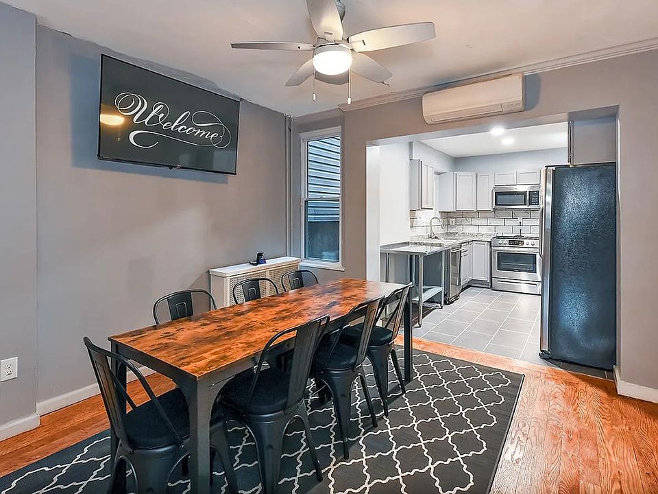 The house is 3 floors, including a basement. It has living room, a large kitchen, a dining room, a small porch, as well as a fenced in back patio with raised beds. Each bedroom is furnished with a bed and side table, as well as a shelving unit. The kitchen is equipped with pots, pans, utensils, and crockery. There is a large dining room table and couches and a coffee table. Additionally there is an in/unit washer and dryer, as well as window AC units. Heat is gas through radiators.