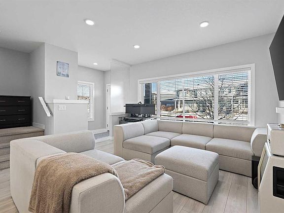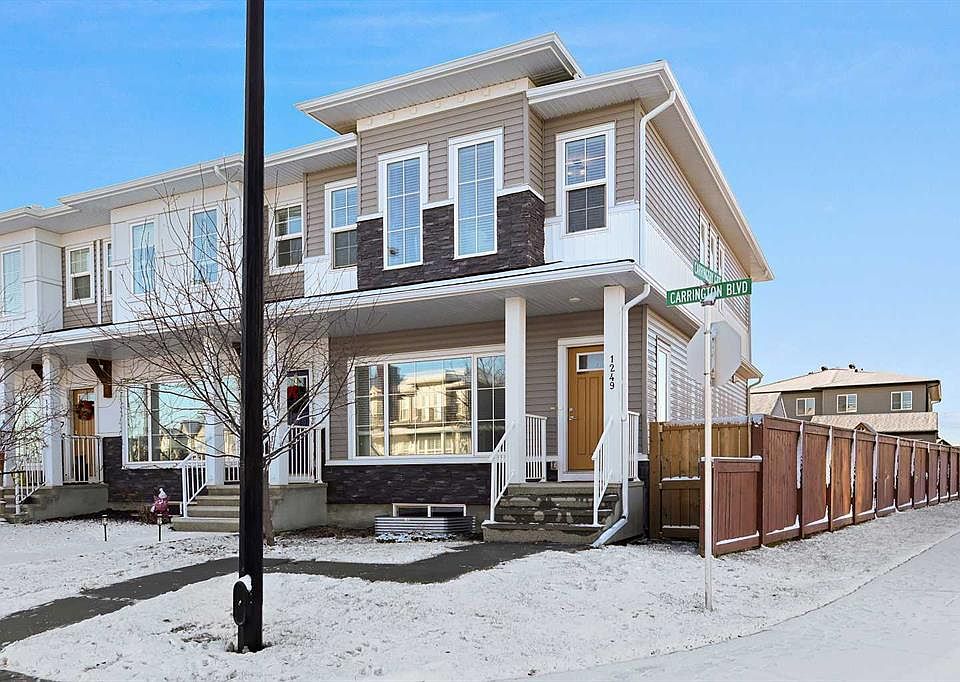 BEAUTIFUL OPEN FLOOR PLAN | EXTRA LARGE CORNER LOT | TONS OF NATURAL LIGHT ALL DAY!! This exquisite town house encompasses a modern palette with fabulous finishes and large living spaces perfectly suited for a family with children, empty nesters or a professional working from home! Situated on an EXTRA LARGE CORNER LOT, the back yard has room for a large family including a side yard for the pup's dog run, a large area for children to play...even a trampoline will fit easily here PLUS an area for DINING AND RELAXING AL FRESCO after a long work day! Let's step inside where a sizeable ENTRY WAY flows nicely into your main living area that features LARGE WINDOWS, HIGH CEILINGS and lots of room for furnishing in style! Enjoy cooking and entertaining in the well equipped kitchen boasting a GAS RANGE, WORKING ISLAND, AMPLE QUARTZ COUNTERS and STAINLESS STEEL APPLIANCES! Tall to the ceiling Thermofoil wood cabinets ( resist fading) with modern linear hardware add to the beauty of clean lines and ample storage capability while a CENTRAL OPEN DINING ROOM is the perfect hub for casual or formal dinners that easily seats 8-10 persons comfortably! The main floor gleams all day long in natural sunlight that beams through numerous windows front and back, easy to keep an eye on the kids playing in the fully fenced backyard while creating in the kitchen. The extra wide main level floor plan also allows for a SPACIOUS WORK AREA where business can be carried out in the privacy and comfort of your own home! The HALF BATH is conveniently tucked away for privacy. Upstairs is a comfortable and roomy place to unwind featuring a LUXURIOUS PRIMARY BEDROOM spacious enough for a king sized bed and side tables, beautiful large windows, sizeable walk in closet and fabulous 4 PIECE ENSUITE with DUAL VANITIES & HUGE GLASS & TILE SHOWER! The UPPER HALL LAUNDRY is convenient and serves as a great work area for folding and ironing...not just a tight closet housing a washer and dryer! Completing this floor are 2 ADDITIONAL LARGE BEDROOMS each encapsulated in natural sunlight and sizeable enough for bigger furniture! The 4 PIECE BATH is conveniently located right beside for easy preparation before bed and early mornings! The lower level basement is wide open for your creative development and offers ample space for any additional lifestyle elements. This beautiful home has so much to offer including WIDE PLANK LAMINATE FLOORS | NEWLY PAINTED THROUGHOUT | NEW ROOF ON HOUSE AND GARAGE (2025) | NEW SIDING (2025) | NEW EAVES TROUGHS (2025) | NEW GUTTERS (2025) | DOUBLE DETACHED GARAGE WITH BUILT-IN WORK BENCH! A PARK AND PLAYGROUND is just steps away for the kids to enjoy! Carrington offers a vast array of amenities just minutes from your door and major routes such as Stoney Trail and Deerfoot Trail are only minutes away for weekend escapes and a quick commute to downtown! Come take a look...HOME IS HERE!