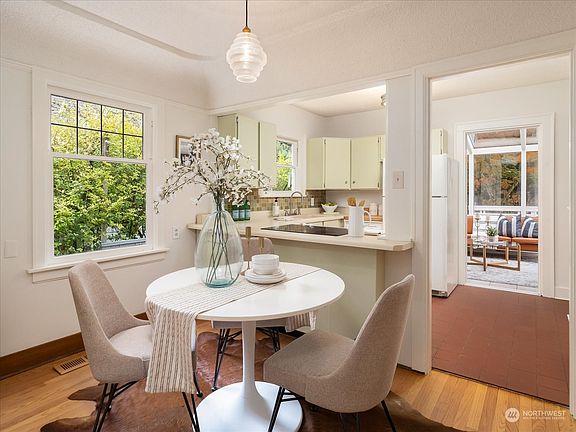 This Craftsman home in prized Maple Leaf is an absolute treasure! Classic coved ceilings, original built-ins, gas fireplace & tons of natural light. Improvements include new roof, fresh paint in & out and refinished hardwoods. Two bedrooms on the main floor, one with sliders to the back deck. Upstairs, a primary suite with full bath runs the width of the house and has a pretty Cascade view & plenty of space for a home office. The clean, unfinished lower level has good ceiling height & a new perimeter drainage system – ready for your value-adding makeover, perhaps a bedroom & rec room? Fully-fenced back, off-street parking. Near shops, restaurants & cafes. Short jaunt to Maple Leaf Reservoir Park, Green Lake. Near bus & Northgate light rail.