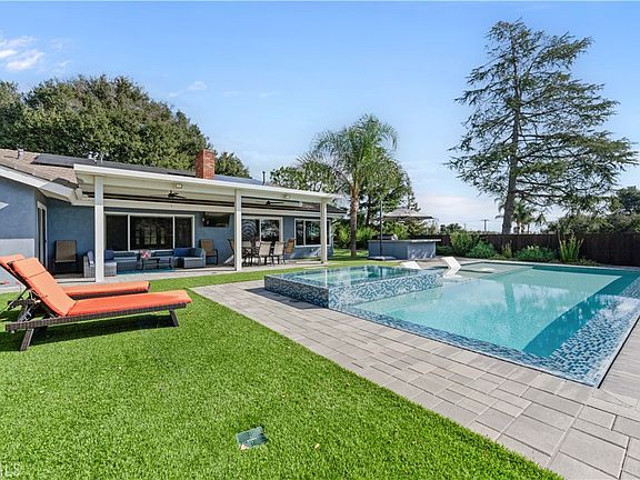 The primary bathroom has several closets, a walk-in shower, and dual sinks. One of the two secondary bathrooms also has a walk-in shower and the third bathroom has a tub & shower combo. The three secondary bedrooms are spaced out at the opposite end of the home from the primary bedroom, giving everyone space and privacy. This one acre lot is your own entertainer’s dream! A brand new sparkling infinity pool and spa is surrounded by sweeping views and multiple seating areas to gather and relax. The covered patio provides shade and comfort year-round, while the built-in barbecue and custom fire pit set the stage for exceptional outdoor hosting. This home has so much storage inside and outside with a three-car garage.