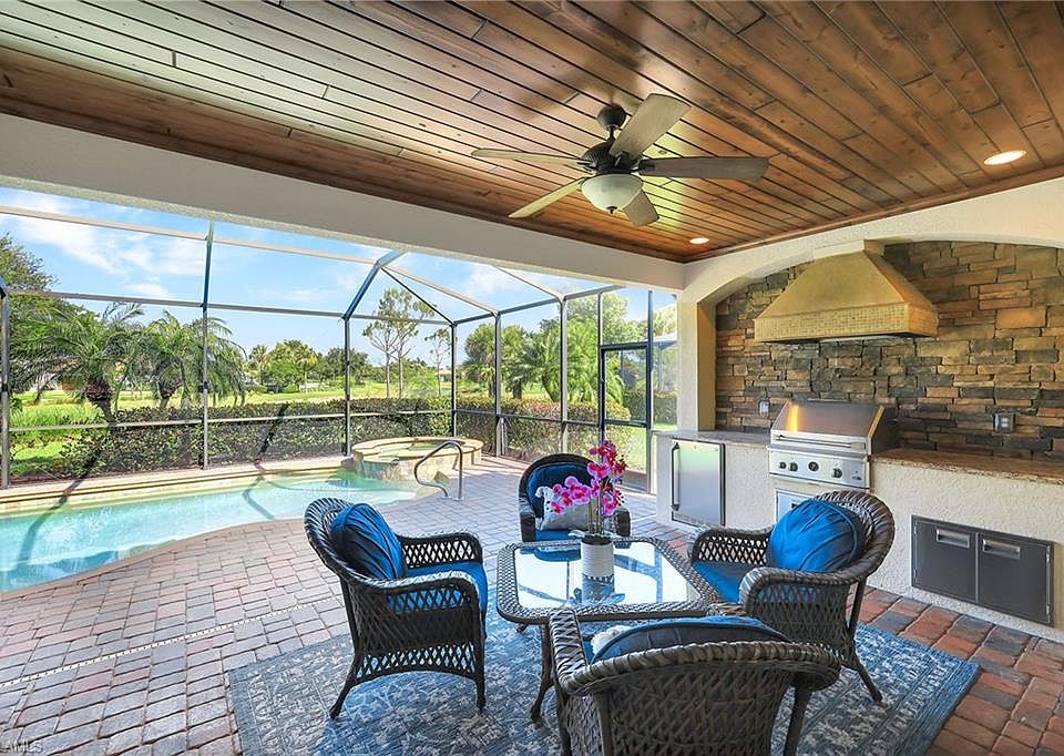 Immediate golf membership opportunity now available with this home at Twin Eagles! You will fall in love with every detail of this spectacular property, perfectly situated on this desirable corner lot. Your private outdoor living space is complete with serene views, a gorgeous pool and spa, outdoor grill and features an oversized covered lanai. This residence has a magnificent floor plan with four spacious bedrooms and a huge living space perfect for entertaining. The primary suite offers two generous walk-in closets, dual sinks, a separate tub and walk-in shower. Additional highlights include crown molding and tray ceilings throughout, new interior paint, a lovely two-car attached garage and a 2021 air conditioning unit. Twin Eagles is a world-class golf community featuring 36 holes surrounded by abundant lakes, preserves and wonderful wildlife. This community has unparalleled amenities. Full golf members enjoy the resort-style pool and spa, restaurant and tiki bar, tennis courts and a state-of-the-art fitness center. New clubhouse renovations are underway. You will be minutes from exquisite shopping, dining and less than 30 miles from Southwest Florida International Airport.
