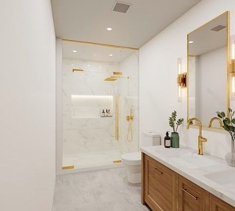 Private deckSleek kitchenSpa-inspired bathStainless steel appliancesPrimary suiteCustom two-toned cabinetryOversized pella windows