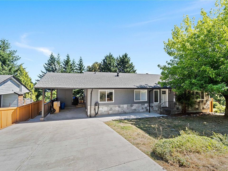 Main-level entry ocean view home with income potential, located in a central and established neighbourhood. The upper level has been tastefully updated with 3 bedrooms, 2 bathrooms, an open-concept living space, and all-new trim, doors, light fixtures, and vinyl plank flooring. The modern kitchen features quartz countertops, new cabinets, and stainless steel appliances, leading to a sunny deck with sweeping ocean and mountain views. The lower level offers a large, self-contained 2-bedroom suite (vacant) with its own entrance, a spacious living area, updated kitchen with quartz counters, and ample storage. The fully fenced backyard includes fruit trees and space for gardening or entertaining. Just a short walk to Coronation Mall and the Holland Creek Trail system, this home combines comfort, flexibility, and convenience. A move-in-ready opportunity ideal for extended family or rental income.