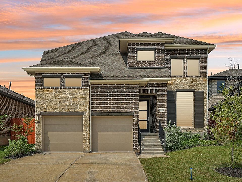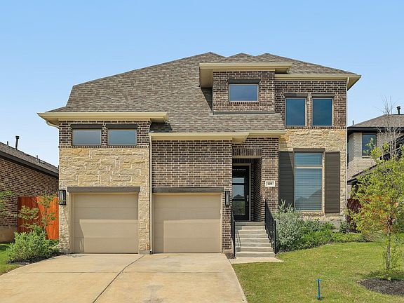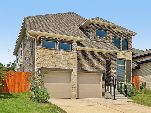 Welcome to 125 Bauer Loop, a beautifully designed two-story residence located in the sought-after Lariat community. This home features a striking stone-and-brick exterior with a grand staircase and elegant railing leading into a tall, light-filled foyer. Just off the entry, you'll find a private front office with French doors, ideal for work or quiet retreat. Inside, the open floorplan showcases soaring ceilings and a dramatic banister overlooking the spacious living area. The large kitchen is a standout, offering a stylish backsplash, ample counter space, a generous island with seating, and a dedicated dining area. Tall windows fill the living room with natural light, enhancing the home's warm and inviting ambiance. The primary suite is a luxurious retreat, complete with an oversized soaking tub, separate walk-in shower, dual vanities, and a spacious walk-in closet. Upstairs, a versatile flex room overlooks the living room below, perfect for additional lounge or creative space. Enjoy privacy in the cozy fenced-in backyard, which backs to mature trees with no rear neighbors. The Lariat community offers exceptional amenities, including a pool, playgrounds, jogging trails, fitness stations, a dog park, basketball and pickleball courts, and a fishing pond. Don't miss the opportunity to own this impressive home in a vibrant and amenity-rich community!