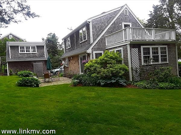 Charming Cape set on beautiful low maintenance landscaped grounds with patio and stone walls. Bright open living space with kitchen, dining, living room with sliders to stone patio, den/ office, bedroom and bath on first floor. Master bedroom with deck and seasonal water views, second bedroom and bath on second floor. Bonus unfinished loft over garage. Easy walk to Vineyard Haven Main Street, stores, ferry and Veteran's Park.