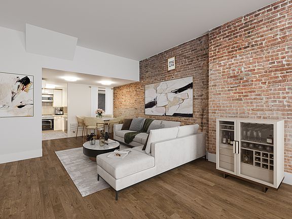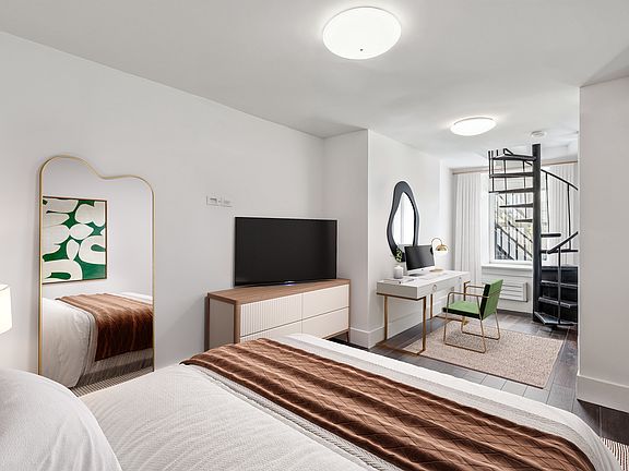 Newly and Fully Renovated, Apartment 1 at 125 East 83rd Street is a 1 bed, 1 bath duplex available for short- or long-term stays, offered fully furnished and fully equipped with linens, kitchenware, and everyday essentials. The expansive living and dining area features an exposed brick wall and an elevated office/reading nook, while the renovated kitchen provides modern convenience. A spiral staircase leads to the spacious bedroom, which offers a versatile space. Additional features include central air and bright southern exposures.