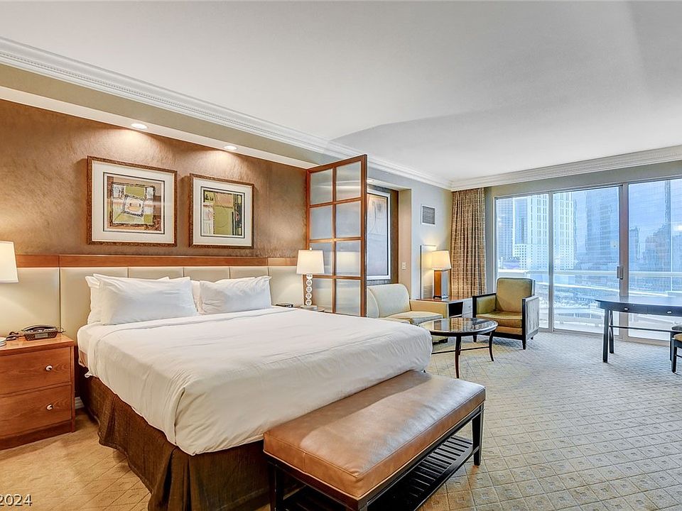 Discover luxury living in this elegant high-rise studio unit on the 8th floor of the prestigious Signature at MGM Grand, Tower 3. This fully furnished studio features a private balcony with stunning Strip views, a jetted tub, and a separate shower. Airbnb is allowed, and it's included in the rental pool, making it an excellent investment opportunity. As a bonus, adjoining unit 805 is also for sale, offering expanded living space or additional rental income potential. Enjoy top-notch amenities such as a state-of-the-art fitness center, on-site restaurants and cafe, concierge and valet services, multiple pools and spas, and an exclusive lounge. Don't miss your chance to own a piece of Las Vegas luxury at the Signature at MGM Grand. Contact us today for more information and to schedule a viewing.