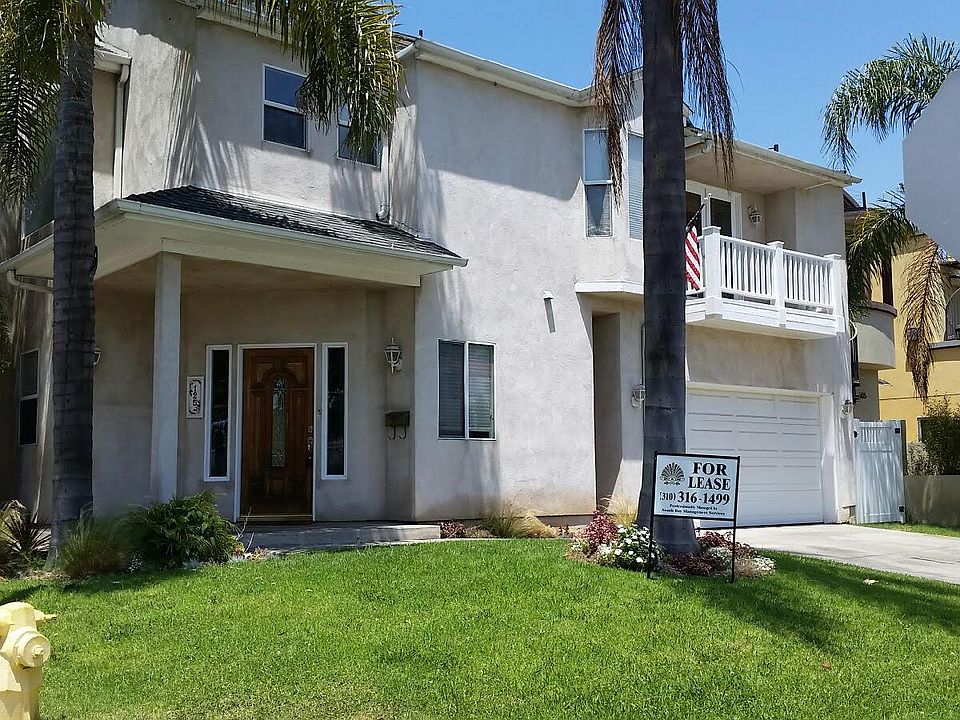 Mediterranean corner house in charming neighborhood walking distance to downtown El Segundo, restaurants, shops, and businesses. 2 story single family home featuring hardwood floors, high ceilings, recessed lighting, bright kitchen with all major appliances (stainless steel refrigerator, dishwasher, wall oven, cook top and range hood, brand new washer and dryer inside attached 2 car garage with automatic opener. Living room with fireplace, kitchen and powder room located on lower level. Upper level offers 2 bedrooms on with an east facing balcony patio, hall bathroom with tub/shower combo, and a master bedroom with a private balcony patio that over looks rear fenced yard. Master bedroom offers lots of natural light and has a Jacuzzi tub , walk in shower, two vanities, toilet area and a walk in closet. Owner will consider a small dog with a pet deposit. Tenant to pay all utilities.
