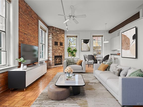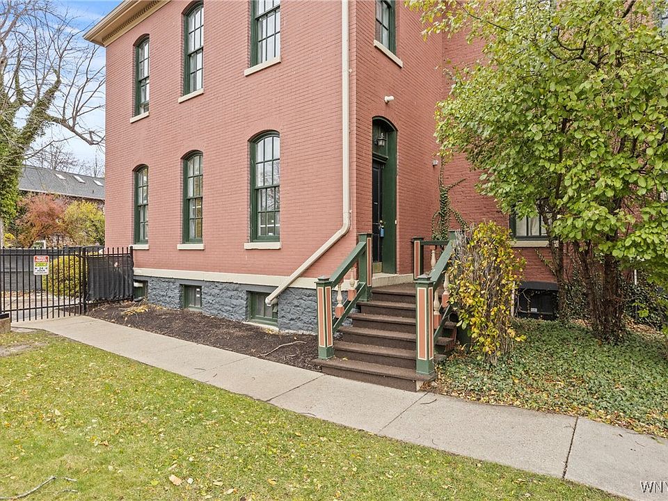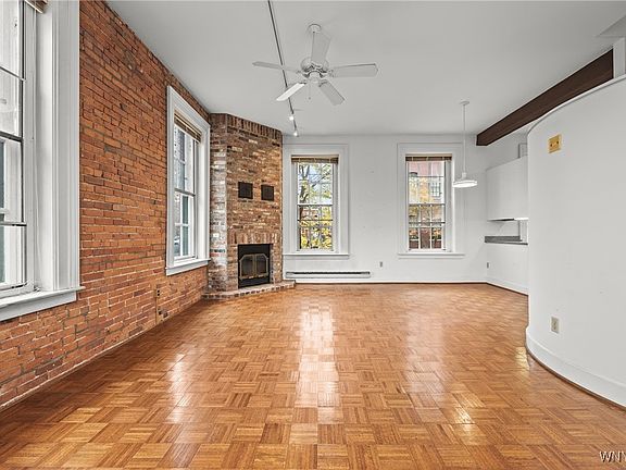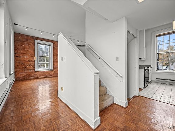 Rare find in this area! End-unit condo/townhouse with its own private entrance and exceptional architectural character! Step inside to soaring 11’ ceilings, dramatic palladium windows, and an abundance of natural light. The living room features exposed brick walls and a wood-burning fireplace, creating the perfect blend of style. A contemporary updated kitchen with granite countertops. A tiled foyer, while parquet floors add timeless charm throughout. This spacious home offers 2 oversized bedrooms, 1.5 tiled baths, and the convenience of in-unit laundry. The unit also includes a full private basement for additional storage or flexible use, plus a dedicated parking space in a secured lot. Rare combination of character and modern comfort in a highly desirable setting—don’t miss it!