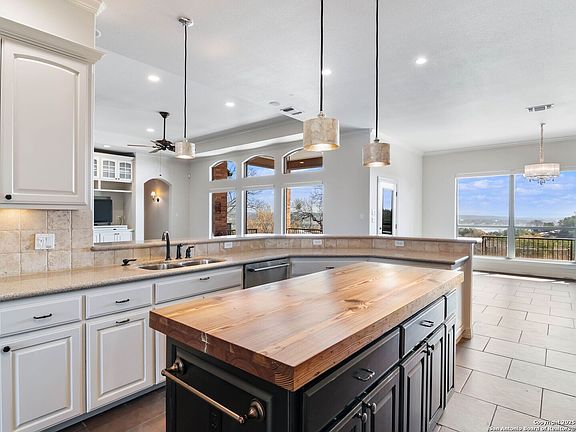 Breathtaking Hilltop Views of Canyon Lake. Perched on 1.6 acres in the exclusive Peninsula at Mystic Shores, this custom home offers unobstructed panoramic views of Canyon Lake and beyond. Thoughtfully designed with style and craftsmanship, it showcases elegant finishes and spacious living throughout. The grand entry opens to an expansive floor plan with soaring windows that frame the lake views. The chef's kitchen is a dream-complete with a large island, Wolf gas range with griddle (LP powered), Wolf electric double oven, pot filler, and Pentair Ever Pure water filtration system. The family room with fireplace, formal and casual dining areas, plus a game/media room provide versatile spaces for relaxation and entertaining. Privately tucked away, the primary suite with outdoor access features a spa-inspired bath with dual vanities, a garden tub, oversized walk-in shower, and an impressive walk-in closet. Three additional bedrooms and two full baths are conveniently located on the main level. Upstairs, a huge game/media room with a full bath and washer/dryer hookups could serve as a fifth bedroom with a sitting area. Additional walk-in storage completes the upper level. Designed for outdoor living, the covered patio is perfect for gatherings while enjoying the spectacular lake views. The raised, level backyard offers the ideal spot for a future infinity pool or lazy river. Additional highlights include: Private well (no water bill) with option to connect to city water, well house plus infrastructure in place, three raised, fenced, and plumbed garden beds, terraced side yard. Oversized 3-car garage with built-in storage and Lift Master garage door opener/phone app control. Located in a gated community with exclusive access to a lakeside park offering a pool, basketball and tennis courts, pickleball courts, picnic areas, pavilion, and miles of walking trails. This extraordinary property combines luxury, privacy, and unmatched views-schedule your private showing today.