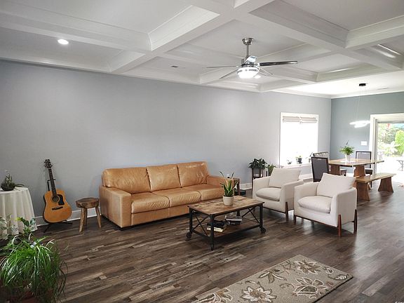 Stone accent fireplaceWater-resistant plank vinyl flooringTwo-car garageLarge patio with firepitStainless steel appliancesCoffered ceilingOpen-concept floor plan