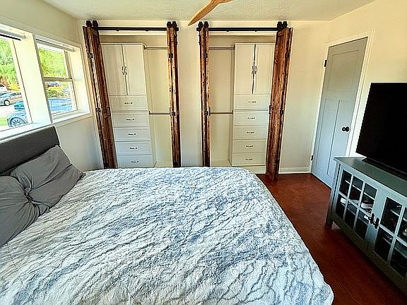 2/3 of the bedrooms have custom build barn doors and refinished closets with custom drawers added for clothes.