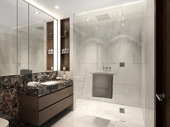 At 664 square feet, this well-designed studio residence features 10' ceilings and southern views. The entry foyer leads to the living/dining room with floor-to-ceiling glass windows flooding the residence with abundant natural light and six-inch stained white oak plank flooring. The open kitchen designed by March & White offers a choice of three different marble color palettes for kitchen counter and backsplash, and top-of-the-line fully integrated Miele appliances including a gas cooktop, dishwasher, refrigerator, speed oven, garbage disposal, and custom designed kitchen faucet. The well-appointed master bathroom offers radiant heated floors with a custom wall-hung millwork vanity and a medicine cabinet with decorative metal edging and recessed lighting, Calacatta marble flooring and shower walls, a frameless glass shower enclosure with rain head and hand shower, and a wall hung Duravit toilet. The residence is complete with a washer/dryer.