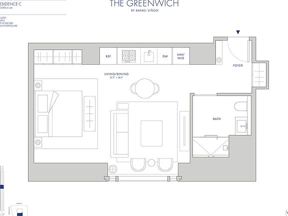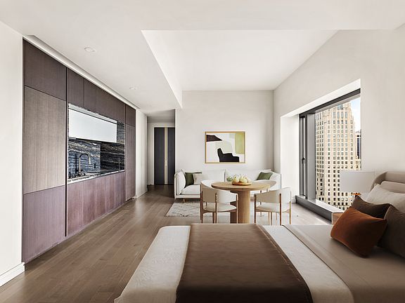 Residence 61C at The Greenwich Condominium by Rafael Vinoly, is a high-floor studio showcasing magnificent southern exposures and views of the New York Harbor and the Verrazano Bridge. Immerse yourself in the breathtaking scenery through a grand picture window, complemented by ceiling heights reaching over 10 feet. Each moment unveils a captivating view of the city skyline and waterfront. At 644 square feet, this residence embodies meticulous design, featuring interior finishes meticulously curated by the esteemed design firm, MAWD.