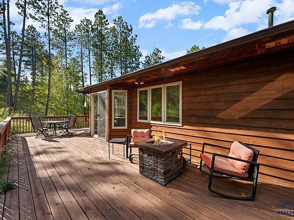 BLACK HILLS RETREAT – RAISED RANCH ON 1.37 ACRES! Nestled in the pines of Edelweiss Mountain, this property blends the peace of a private getaway with the comfort of a year-round home. Surrounded by trees and tucked into the hillside, you’ll enjoy the quiet you crave while staying close to Pactola Lake, Mount Rushmore, Crazy Horse, Hill City, Keystone, and Deadwood. With U.S. Forest Service land nearby, endless recreation is right at your doorstep. The main floor features vaulted ceilings, a cozy living room with gas fireplace, and a fully stocked kitchen that flows into a spacious dining area. Patio doors open to a back deck nestled against the hillside—perfect for morning coffee, wildlife watching, or stargazing at night. Two bedrooms and hall bath complete the main level. The lower level offers flexibility; currently set up with a living area, sleeping area, full bathroom, and a walkout to a private patio with hot tub. The drive-under garage connects directly to a lower-level mudroom/laundry room, adding convenience after outdoor adventures. The home is SOLD FULLY FURNISHED — including the hot tub — for true turnkey living. The 1.37-acre lot is a combination of two parcels, which may be separated again, providing opportunities to build an additional home or garage, expand, or sell. Buyer to verify. Whether you’re seeking a primary residence surrounded by nature or a ready-to-rent vacation property with growth potential, this raised ranch delivers the best of the Black Hills lifestyle in one complete package. Listed by Taryn Pike with Engel & Völkers Black Hills, 605.840.0385.