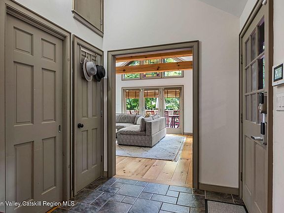This beautifully updated, turnkey farmhouse on four private acres thoughtfully combines rustic character with modern updates, offering everything you need for the perfect upstate home. A circular drive and bluestone walkways lead to the welcoming covered entry framed by stone walls and mature trees. Inside, exposed beams, wide-plank hardwood floors, and a dramatic stone fireplace reflect the home's 1900s origins, while thoughtful renovations add modern comfort. At the heart of the home, the well-appointed kitchen connects seamlessly to a spacious dining room and features custom cabinetry, stone counters, and a Wolf gas stove. A separate walk-in pantry provides ample storage, while an additional living room/home office offers flexible space to suit your lifestyle. Two more living areas - a cozy living room and a spacious family room - provide options for both gathering and quiet downtime. The cozy living room offers a flexible retreat equally suited for movie nights, curling up with a book, or even doubling as guest sleeping space when the house is full. From the bright family room with its exposed beams and cathedral ceiling, French doors open onto a spacious wraparound deck, perfect for cooking, dining, and relaxing while surrounded by woodland views and the sounds of nature. A newly renovated half bath with laundry completes the main floor.