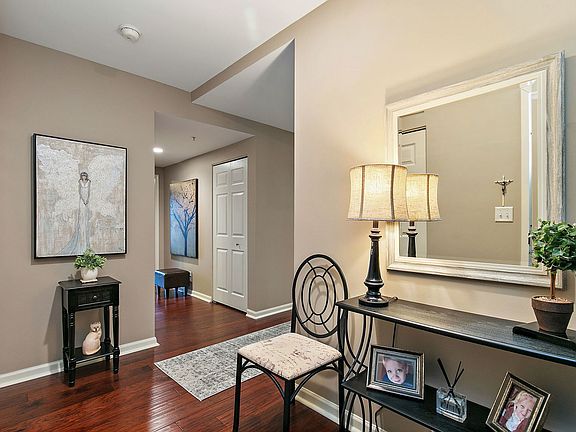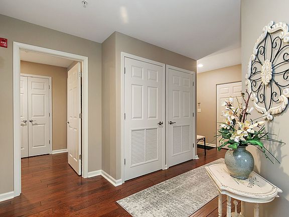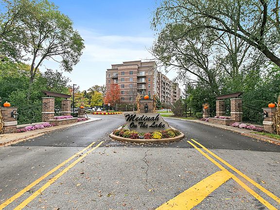 There's nothing to do but move in! Welcome to Medinah-on-the-Lake, one of the area's most sought-after communities. This former builder's model still shows like new, offering a perfect blend of elegance, comfort, and modern upgrades. Step inside this spacious and sun-filled Corner unit and immediately notice the custom hardwood floors, designer paint, upgraded trim and molding, and stylish blinds throughout. The kitchen features stainless steel appliances~ refrigerator and double convection oven new in 2022~ granite countertops, an eat-in breakfast bar, and a large pantry. The open concept layout is ideal for entertaining, with a beautiful oversized patio door leading to a newly renovated patio overlooking the tranquil lake. Originally a three-bedroom unit, this home has been thoughtfully reconfigured to include a spacious formal dining room, perfect for hosting gatherings. Additional highlights include an in-unit full-size washer and dryer, upgraded six-panel wood doors, cordless blinds, ceiling fans throughout, and ample storage. The primary suite offers a luxurious retreat with a granite double-sink vanity and walk-in shower. Enjoy resort-style living with community amenities including a swimming pool, fitness center, clubhouse with kitchen and fire pit, and beautifully maintained common areas. Surrounded by scenic lake views and lush nature, this home offers peaceful living with convenience to everything. This home won't last long; book your showing today!